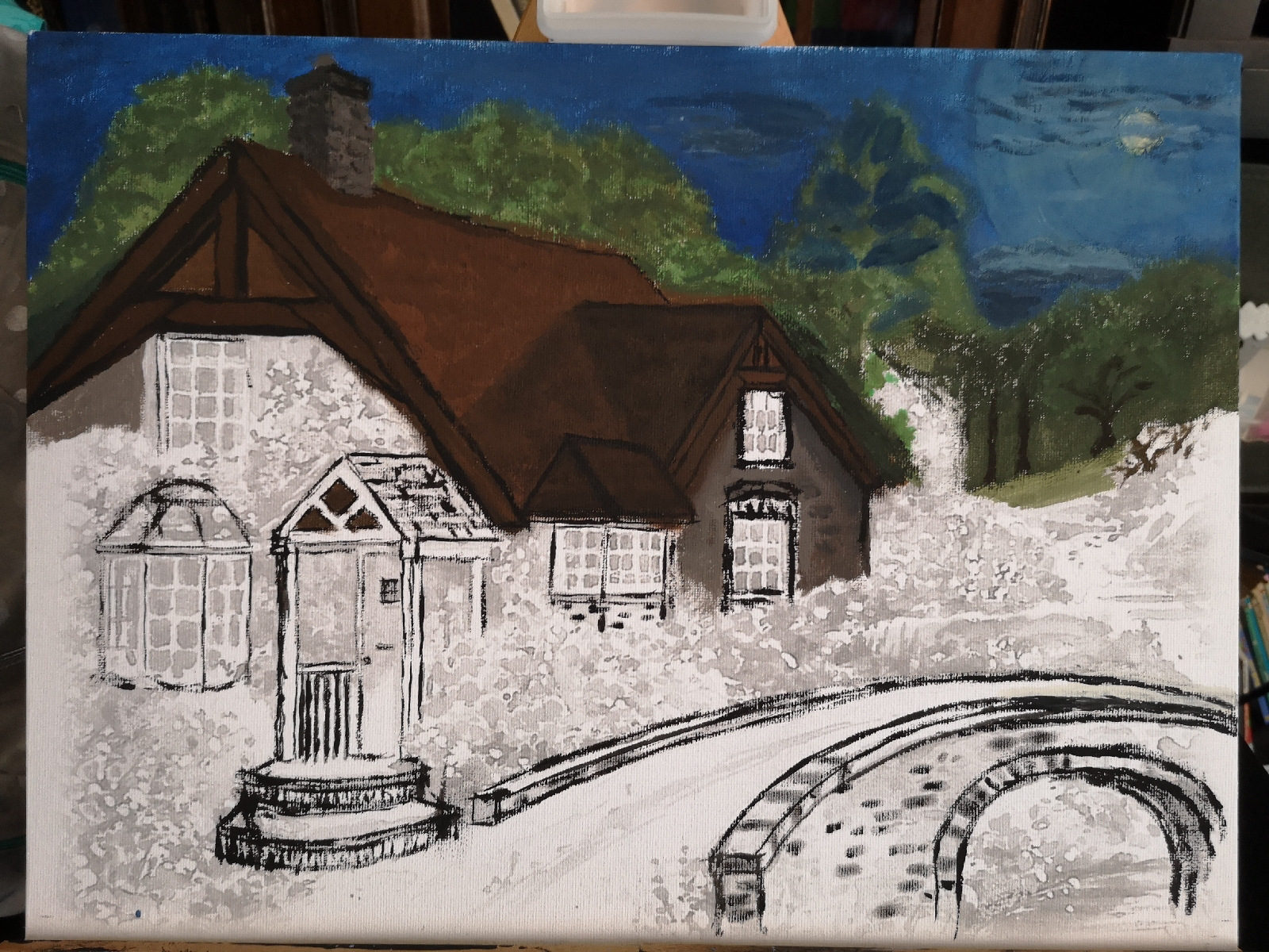 1) I used black to touch up and darken some of the lines so it was easier to see the different angles and faces of the cottage.